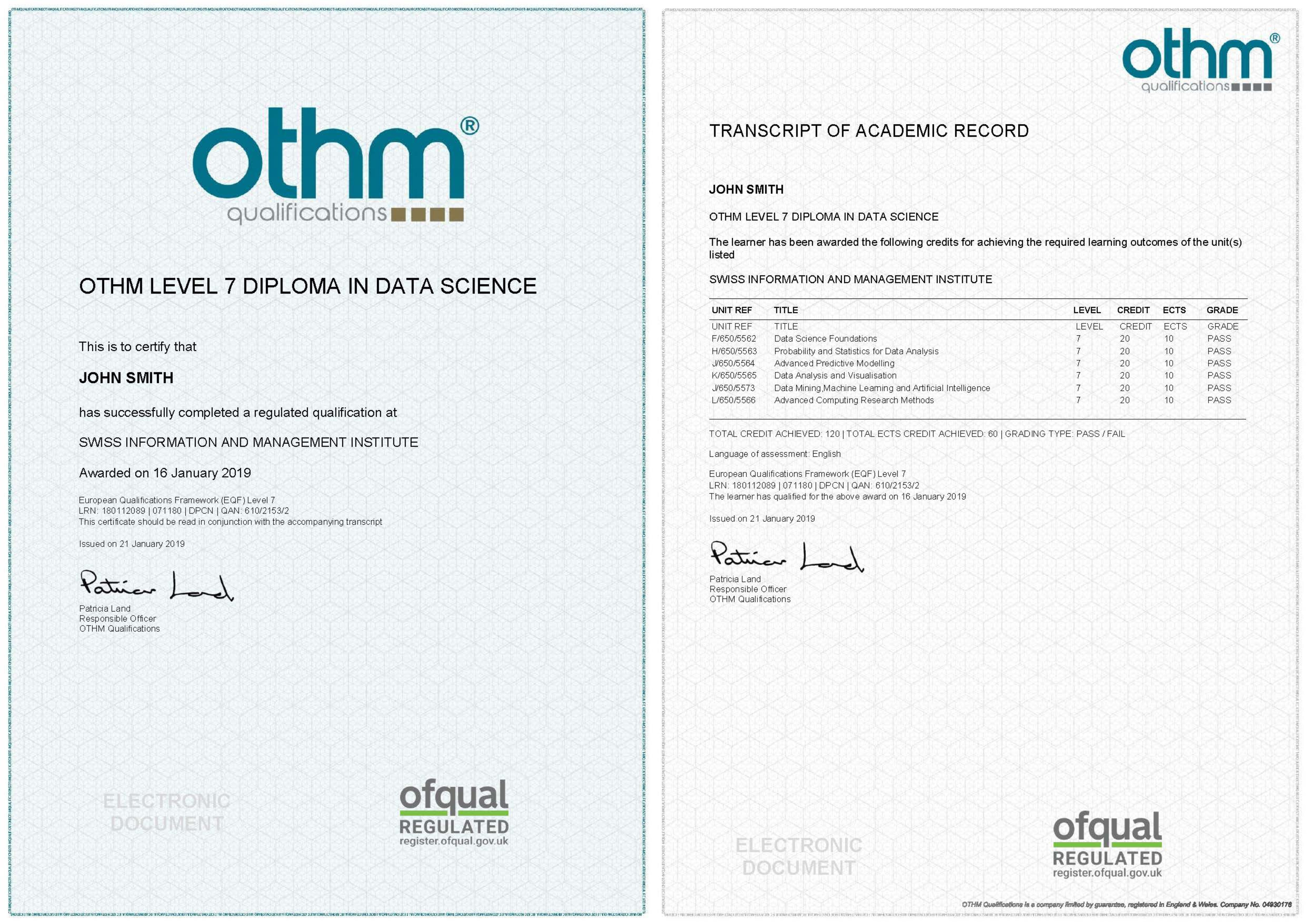 - Sample Degree - Transcript OTHM Level 7 Diploma in Data Science: CLICK HERE